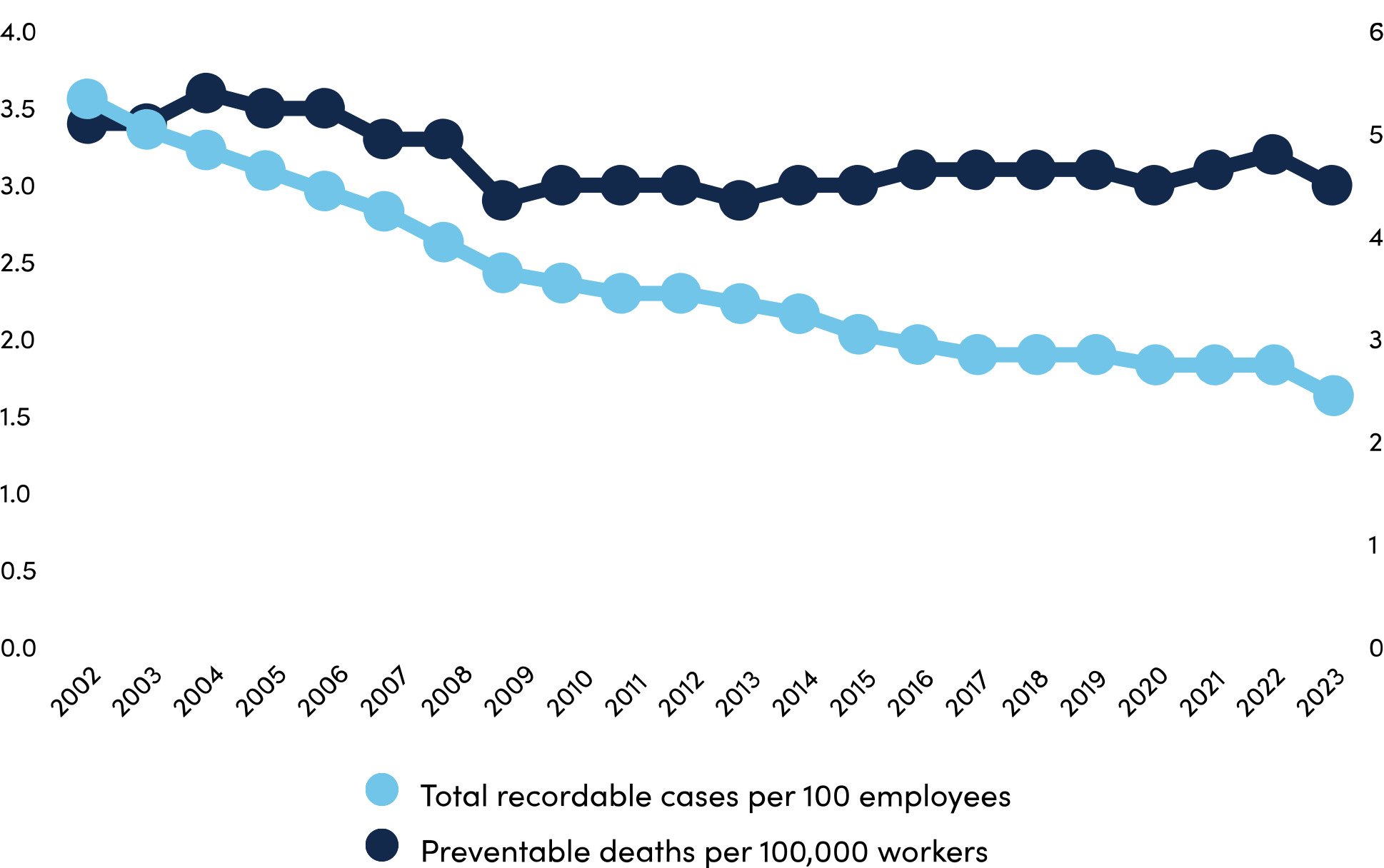 At the same time, an Occupational Safety and Health Administration (OSHA)-required metric—the total recordable incident rate (TRIR)—fell from 3.3 per 100 workers to 2.4. Many businesses use TRIR as their only measure of safety performance.